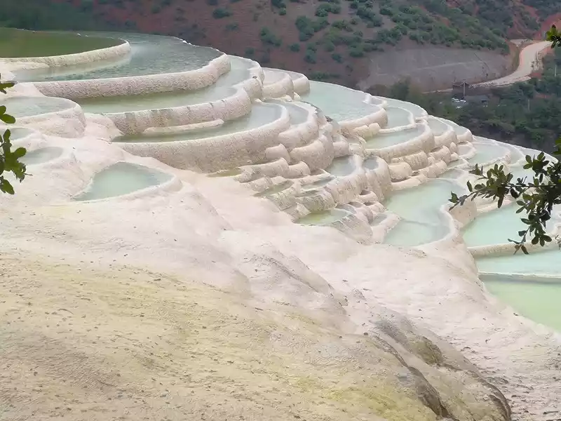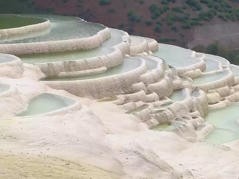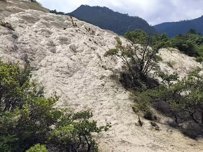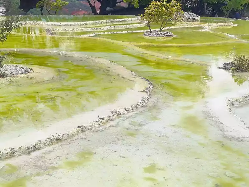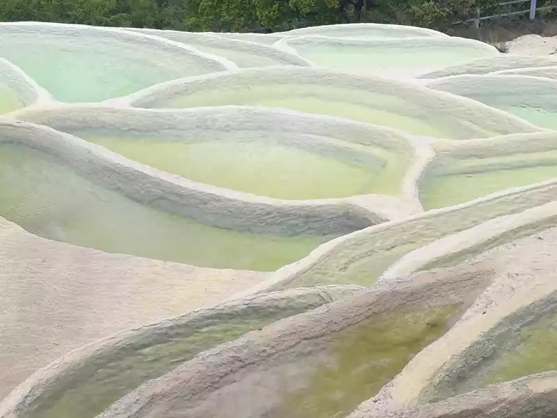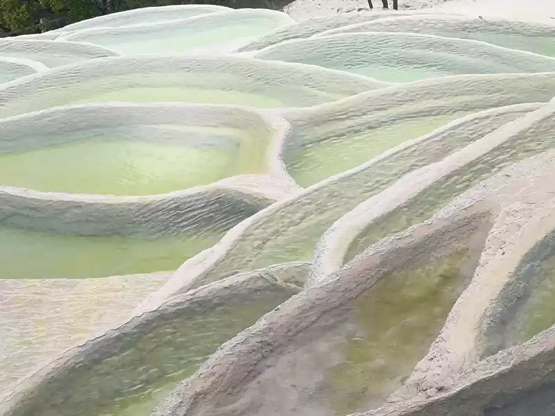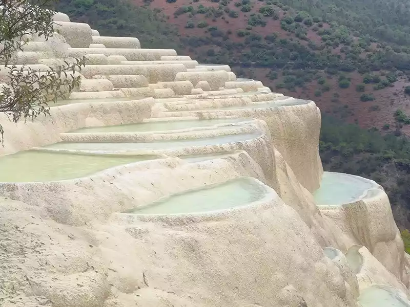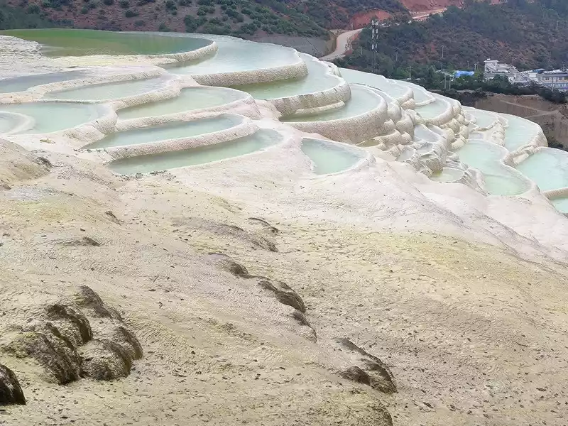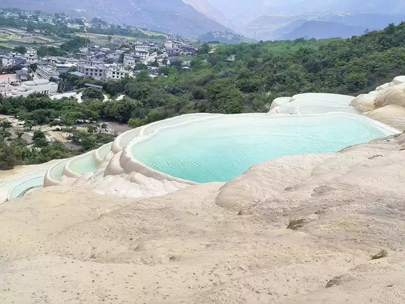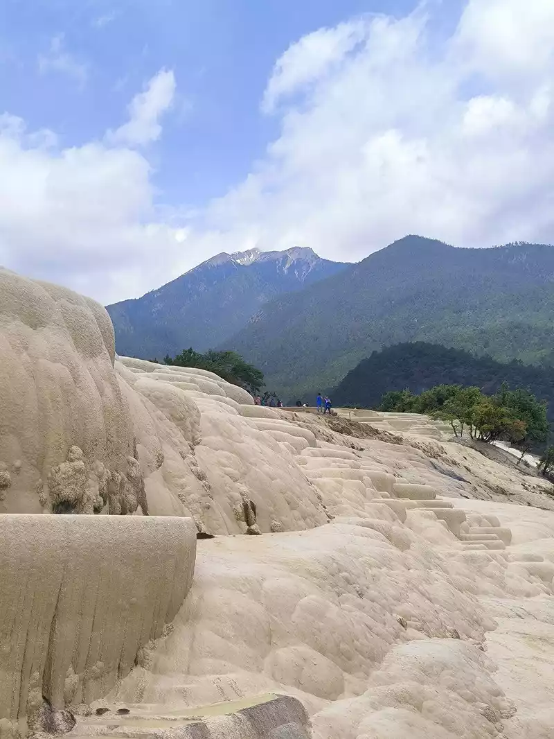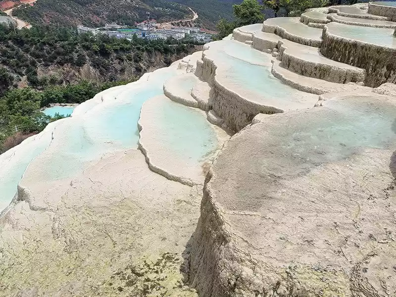 Baishuitai, also known as the "Fairy's Relics Field", is the largest Huaquan terrace in my country, covering an area of about 3 square kilometers. It is a natural wonder formed by the dissolution of calcium carbonate in the spring water. The basic principle is the same as that of Huanglong in Sichuan. When the spring water flows slowly downward, the calcium carbonate is exposed to sunlight, and calcium bicarbonate is formed after the water evaporates. The white sediments gradually settle, and then continue to cover the surface to form the spring Huadi. Over the years, a terrace curtain is formed. From a distance, its shape resembles layers of terraces hidden among green mountains, and some sections look like solidified waterfalls. The scenic area includes the Fairy's Relics Field, the Colorful Yaochi, the Child-Seeking Cave, the Holy Water Source, the Mugao Stone Carvings and other attractions. As early as the Tang and Song Dynasties, it has become a famous tourist attraction in western Yunnan.