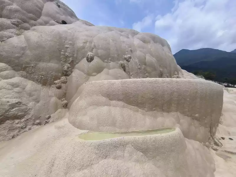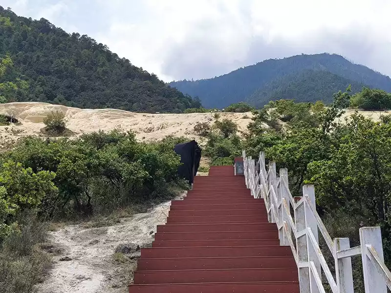 The sky was cloudy when we went up the mountain, but it cleared up completely at noon and the sun was shining brightly. At 1 pm, we went down the mountain from the east wooden plank road. On the way, we could see large areas of travertine slopes, but most of them were quite far away. We visited here for more than 2 hours and set off on our return journey at 2:30 pm.