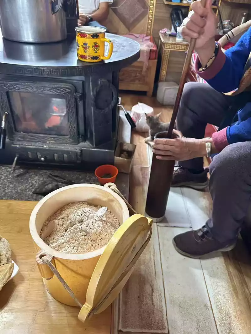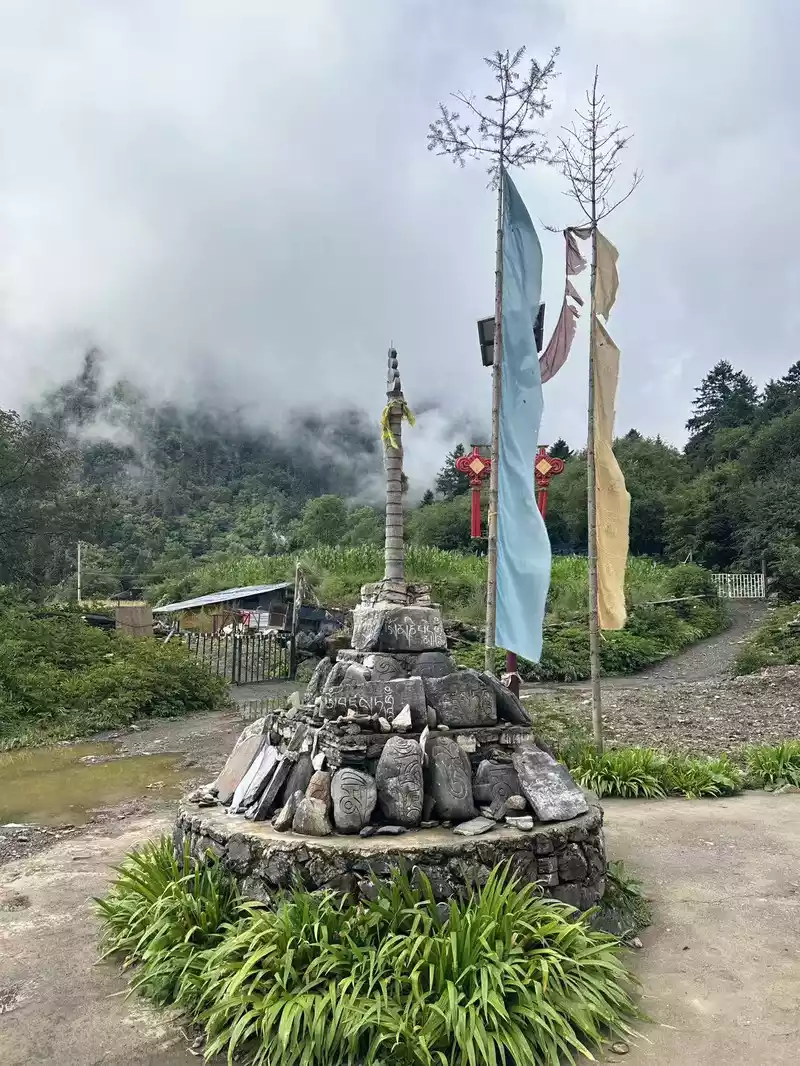 Another 3 kilometers up, there's a supply station with abundant food. You can also purchase pine and cypress incense powder and prayer flags, used by Tibetans in their traditional sang rituals.