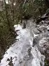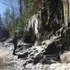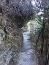 As we continued up, it started to get icy on the path. There were more rocks (actually more like slate) on the path covered with ice. This made the trek slower but passable. There was a section with really large ice cicles on the rocks on the side of the mountain making for another photo op.