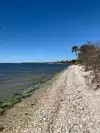 This beach is a little steeper and Shelly. It is within the park so it requires a pass. Just get one it’s nice. No dwellings. All nature. Ramp access. No stairs. Good fishing.