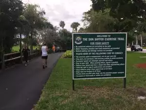 This paved path circles the Turnberry Country Club and Spa, golf courses and many condo buildings. There are drinking fountains for both humans and dogs. Buses stop along the path and there is also parking across the street in the Aventura Mall Parking lot. The path is just under 3 miles and for those interested there is a new Starbucks open to the public just inside the Turnberry Country Club entrance.