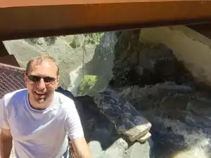 They have added a platform here over the years that lets you walk out over the falls for some dramatic views! The scenery around you is wonderful, and the falls go right under to road!!! I love stopping here.