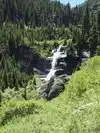 You can hear the rushing water all the way up the hill, but then you come out of the trees to a view of majestic peaks with many waterfalls cascading from snow fields a few thousand feet above you.