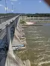 The Big Dam Bridge is a walking bridge across the Arkansas River in Little Rock. The River is in flood stage as of June 1, 2019 expected to crest June 5, 2019. Areas leading to the BDB are flooded and blocked off, and the bridge is not currently accessible. There have been no warnings that the bridge itself is structurally threatened, but the river is higher and faster than experienced in about a century, and all precautions are being taken to protect life and property. If you are visiting Little Rock the summer of 2019, please check before trying to go near the bridge. The bridge is expected to reopen as soon as it is deemed safe for visitors.