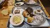 When the dinner bell rings, everyone lines up for a BBQ chicken and ribs dinner with potatoes, coleslaw, mac & cheese, rolls, and peach cobbler. Iced tea, lemonade, and water are included. A bar is available for adults. Although there is a full dining room, they have devised a method of serving all very quickly. When everyone has been served, anyone can return for second servings. Wait staff is friendly and attentive. The owner himself circulates around the dining room chatting with everyone.