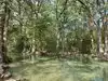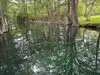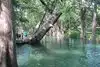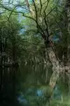A landscape that captivates with its beautiful cypress trees whose roots are hidden under the crystal-clear water of the space delimited for swimming, floating, or jumping from a rope.