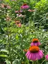 So much in bloom - shaded areas and water features to keep cool. Visited with a friend from England who has her own lovely garden. She thoroughly enjoyed it. Beautiful!