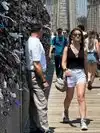 Walking across the Brooklyn Bridge is an iconic experience, but don't expect to be able to take the perfect pic as this is a popular attraction. The number of people selling tack (hats, pins, tees, the chance to take your picture) was overwhelming. Welcome to New York City.