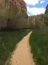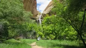 If you have limited time in this National Monument, do this hike! It's a great introduction to the area; if you start early in the morning or do it later in the afternoon/evening, you will be mostly shaded from the sun. Doing this hike in July, we opted for a 7:00 start and were glad we did. The trail was mostly shaded going out at that time. It's very peaceful and there aren't the crowds of other UT National Parks. The falls were stunning, the water clear and refreshing, the bottom a soft, soft sand. The hike back was a bit warm. Wear a hat & sunscreen, bring plenty of water. Most of the trail is either packed dirt or sand which can be somewhat challenging to walk in. I suggest hiking shoes or boots rather than tennis shoes. Toilet and water available at the trailhead.