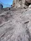 After the steep hand rail section, there's a brief easy section. Not flat but easy. Then you start scrambling up several chutes of large rocks. Most people use they hands and feet. Be careful. The rocks are coarse and a slip here will leave a mark.