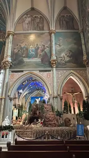 Beautiful historical basilica with inspiring biblical stories displayed in stain glass and paintings. The spectacular Christmas crèche.was displayed in December.