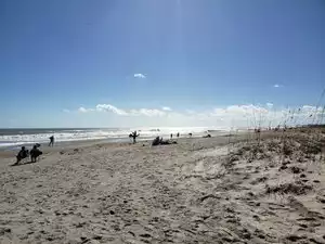 A nice, accessible walk to the shore. View of the Cape Canaveral lighthouse, which was a nice boon. too far for a good photo, but enjoyed looking up to see it behind the ships leaving the port. one inbound, three outbound while we were there. Surfing, fishing, sand castles, one dog on a leash encountered.Several species of birds, sand crabs, not many seashells our day. Restroom was supplied. Shower close to boardwalk, handicap ramps. around 25 spaces to park with construction area barring more. Pleasant day spent here, would visit when in area.