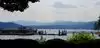 Lake is a pretty blue surrounded by lots of trees. There are a few places to eat and some large hotels.