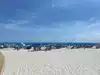 Great Beach ! Sugary sand; refreshing water; lifeguards; chairs and umbrellas for rent and showers; footbaths; changing rooms and even swings in covered areas. The undertow can be a bit intense but children shouldn't be swimming unattended anyway. Free Parking is a breeze; at least in early September. You couldn't ask for more.