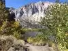 There is a 2.5 mile trail all the way around Convict Lake, which lies just 15 minutes south of the resort town of Mammoth Lakes. The trail is mostly flat, which is nice for those unaccustomed to the 7580 foot altitude. The north side of the lake is exposed and sunny, while the west end has an aspen forest, with a long boardwalk to cover the inlet streams. The fall colors are great here. The north lakeshore rises steeply to the summit of Mt Morrison at 12,277ft, and is often in shade. There is a road with adjacent walking path for one half mile along the south and southeast end. Look for ideal slate skipping stones here on the small beaches. Parking may be limited on a busy day.