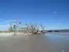 Lovely spring day when we walked in to this beach. (Unmarked, near the northeast tip of the island - ask the locals.) Parking free alongside the road. Hundreds of busy little land crabs at work under the sandy path and in surrounding marsh. Walk from road to beach is easy and short. The beach is very cool. Over the years, the beach has eroded leaving behind trees that have turned to "driftwood". All long the beach, these trees create endless photo opportunities and also many little semi-private nooks for laying down your beach towel. Beach is flat and hard therefore bike-able. Very pretty spot.
