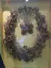 Also on display was a blue wedding dress, an 1886 classic fashion style during its day. White was not worn yet for that special day. This type of dress was intended to also be worn for other social and formal occasions after the wedding. Next to it was a hair wreath. To the modern viewer, this might seem peculiar and a bit eerie, but during the Victorian era, it was a customary art, made as a memorial and a token of love. A small amount of hair was taken from the most recent deceased of the family and usually fashioned into a flower, and hang from the center. This remained until another relative died, and then it was moved to the side and made part of the outer décor of the wreath.
