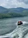 We were camping in Cherokee at Yogi Bear Campground and drove over to where I booked a 24 ft pontoon boat from Alarka Boat Dock for half a day, we ended up staying the full day 10am - 8pm. The ride over was about an hour. This lake is very beautiful with clear blue-green water, the views are awesome. We boated all around the lake up to the dam and back. We stopped along the way at different islands, to swing off the rope swing and just out in the big middle to swim and tube taking in all the beauty. Out of the entire trip- this day was my favorite part of the trip! My kids all had a great time as well as my two dogs- a great Dane and dachshund.