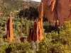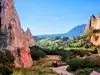 What a sight! Dramatic red rocks of so many whimsical shapes and all shades of rusty orange, bright red, pale white towering on the background of green mountains create unique and magically beautiful landscape.