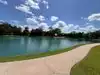 There is a large pond separating the various buildings from the walkway to the site. It is beautifully landscaped and well taken care of.