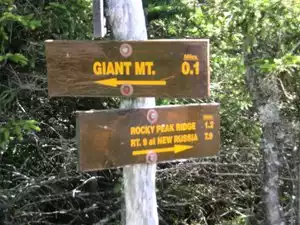 I hiked this mountain with my wife and we were glad for the choice. It has an elevation of 1410 m(4627 feets) with a denivelation of 930 m(3050 feets). We opted for the shortest trail but steeper(Zander Scott trail marked with blue signes). To reach the start of the trail there is a parking on the route 73 a little before Chapel Pond on the right. there are enough spaces to park the car. The trail has 6 miles round trip. At 0.7 miles there is a beautiful lake (Washbowl pond). at 0.1 miles to the summit there is an indicator showing Giant summit to the left and Rocky Peak to the right.