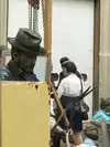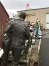 My son posed at the back of the line of men waiting in a Depression Era breadline.