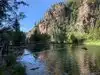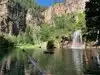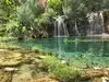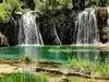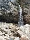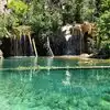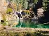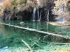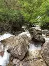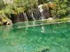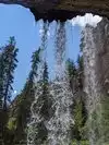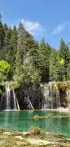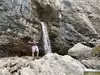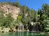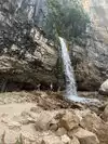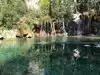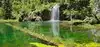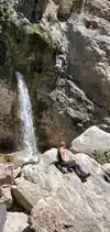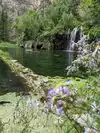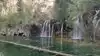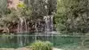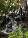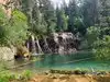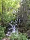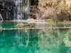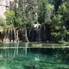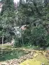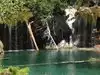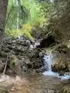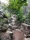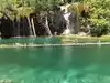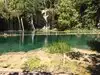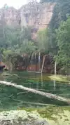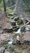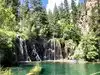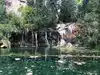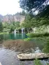 This trail is about 1.8 miles long but it is up and steep. However, the reward is well worth it. At the top the trail splits into a Y. Go left a short way further to discover a nice waterfall that you can walk behind. Go back down the trail to the Y and go right. This is a wow factor. One will discover a small lake/pond size body of water created when the lake was located higher up the mountain and collapsed. Blue/green crystal clear water held in place by travertine dams.