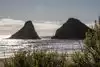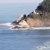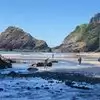 From Rte101 between Yachats and Florence a turn into the Hecata Head Lighthouse parking area brings you to beatiful Cape Creek Beach, set between 2 high bluffs with a wide beach, small rocks and mostly hard packed sand. There are 2 large triangular rock features just off the shore and a few shallow caves to explore as well. There are bathrooms, and a gift shop on the short walk to the lighthouse. The lighthouse was closed for renovations but park staff were available to provide information and answer questions.