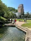 Part of the park is on a street front with stores, restaurants, etc.