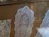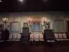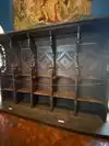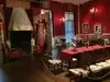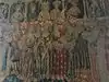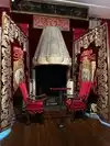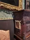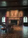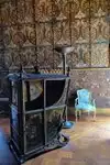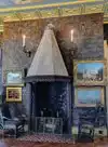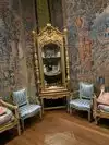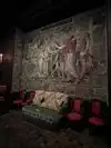 -Highly crafted chairs, coffered ceilings and a score of large tapestries.