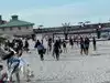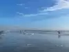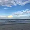 A beach with white and less height of the waves in a long sea shore. Many visitors were took sun bath and sea bath. Both baths are good. The waves are less height and very interesting to immerse ourselves into the sea when waves hit us. On one side main buildings and our activities are being watched by coastal protection staff.