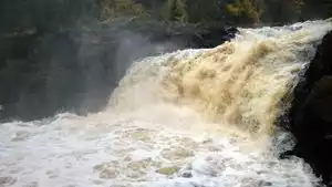 While this park does have a very nice campground with modern shower & toilet facility, the location just off the highway results in traffic noise, especially from trucks and motorcycles. However, the remoteness of the park means highway traffic levels are light in the daytime and extremely low after dark. The walk along the river trail back to the falls and Devil's Kettle is of moderate difficulty and worth the hike. A visit to the historical Naniboujou Lodge across the highway from the park is an easy walk and provides a place to get a meal in their beautiful dining room, or to shop the gift shop to gain access to their extensive private Lake Superior and Brule River frontage.