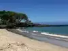 Close your eyes and imagine the perfect beach, a crescent of white sand, calm waters, ringed by lush vegetation with few people -well, that is Kauna'oa beach. Located about 32 miles north of Kailua-Kona off Hwy 19 near mile marker 68, the beach is accessed from the private road at the Mauna Kea Resort. As there is very limited parking for the public (only 40 spaces) plan to arrive early (before 8:30am). At the gate house to the resort you'll be given a parking pass. After you drive through the resort, you'll reach the parkinglot adjacent to the golf clubhouse where you unload your beach paraphernalia and start the long walk downhill. There is a restroom with changing room and an outdoor shower for washing off the sand at the bottom of your walk. Easy to push a stroller up and down the walkway, but a wheelchair might prove challenging.