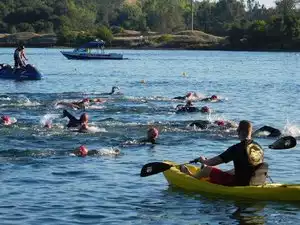 Have done many Tris. Lake Natoma was the freshest water yet for me. Felt very clean. Temps in the low-mid 60's (in early June) for a comfortable wetsuit swim. Would enjoy swimming there again.