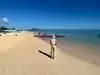 White sand for as far as you can see and clear blue sea with calm waters that’s is shallow if you have small children who just want to play or you can swim out a little further or just float about. Perfect for all including families with younger child.. plenty of palm trees along the beach if you need some shade and showers and toilet facilities along the way.