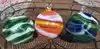 Following his instructions she carefully worked starting with clear glass and added colors; they pinched and twisted the heated combined glass and she slowly (under his helpful instruction) blew into the tube and watched the float grow. When finished, but still glowing glass hot it was placed into a kiln to slowly cool down over night.