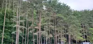 Monument Mountain hiking trail starts on route 7, very easy to find. Many tall straight pine trees in view.