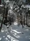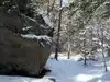 With the snow on the ground we took the blue Indian Mountain Trail and cut onto the red Squaw Peak Trail. Indian Mountain Trail is easier, a small stretch is slippery but manageable. Squaw Peak Trail is much more difficult. The snow on the trail is packed tight with previous hikers and became very slippery, we had to slide down on many places. Devil's Pulpit is a little bit detour on Squaw Peak, but worthwhile.