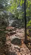 invigorating steep climb for 3/4 of a mile up to a rocky summit with beautiful views over the Great Barrington and the Berkshire Hills Alternate route is more gradual and 1.5 miles Beautiful forest and boulders, well worth the effort