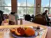 There is a restaurant with a handful of food choices. We ordered the Buffalo Burger and were not disappointed. Delicious. The lines for the food were chaotic. After waiting in a long line to order, you just stand around waiting for your number to be called. They don't tell you where to go to pick it up. They don't tell you where to get condiments or napkins. The tables are dirty and need cleaned. A few workers were just standing around talking.