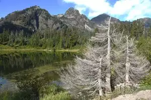 At the end of the road up Mt Baker Wilderness area, at Artist Point, the elevation is 1,545m. But on the road up the mountain there are a couple of lakes, one called Picture Lake from which you can get wonderful reflections of Mt Shuksan. At the top both mountains can be seen, although Mt Baker disappeared in cloud almost as soon as we arrived. Mt Shuksan, although lower than Mt Baker, actually looks more impressive because there are no other mountains in front of it and it is closer. It too had mist blowing up blocking the view occasionally and at one time there was even a hint of snow in the air. It was 14oC at the top but there was still a fair amount of snow on the ground around the car park even in August. From Artist Point a number of trails can be walked, depending on your fitness and the weather.