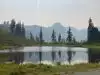 A short way down the mountain, we stopped at Picture Lake. Our plans for a leisurely stroll were cut short by some very aggressive insects. We ended up running back to our car with horseflies attacking mercilessly. (No one else there seemed bothered, so I'm chalking it up to some new shampoo my husband and I had both tried.)