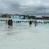 -boots and outdoor shoes are allowed in the entire water park. I saw a man standing in his rubber boots right at the pools edge, by the end of the day we were walking in bare feet through muddy and outdoor sidewalk salt water.