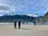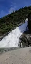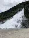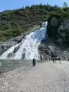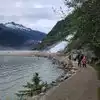 This is an easy, flat walk (about 12 min at a brisk pace) to the base of Nugget Falls. The falls are powerful and loud; you can really appreciate it at the end of the walk -- be sure to go out on the beach at the end of the trail for better views of the falls and glacier.