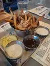 Nice presentation. Does seem they overcrowded the fryer as some are crispy, some are flaccid. May also consider a different severing vessel, as this would holds steam and works against the crispiness. Maybe a small basket, or small colander style bowl. Dips are good, no improvement. The pickles are perfect, would love to see them on a Nashville hot chicken strip sandwich (I know it’s a cliche, but always give the ppl what they want). (Put bourdon in the Nashville hot sauce!) (Old Glory’s clarksvile hot) (right down the road from Nashville, but better!)