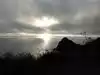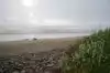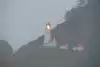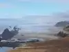 The fog creeps along the shore, across the highway and up the mountains with cracks of sunlight seeping through.