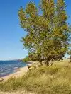 A nice Michigan lake beach with nice sand. Personally I think this beach is just a touch overrated. The beaches in Traverse city and surrounding are just as nice and less crowded. Not much natural shade so you really need to haul your own in. My husband and I walked from town (took the ferry across) and hiked up the trail and brought lunch. We didn't spend a lot of time there with the droves of people and lack of shade.