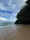 There is a very narrow path you have to look closely for right before you get to the St. Regis with a small parking lot that holds about 6 cars. Then its about a 10 minute âhikeâ down a very steep trail you have to use a rope to help you down and back. Although the couple times i have visited we didnât swim with the waves and coral bottom, but you can go in a little and swim some. The beach and views are terrific and just another fun and beautiful little gem here in Princeville.