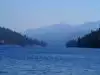 A winter's look at Payette Lake in McCall Idaho January 2019. A beautiful day with just enough hints of snow on the mountains. The deep blue water reflects the winter mountains.